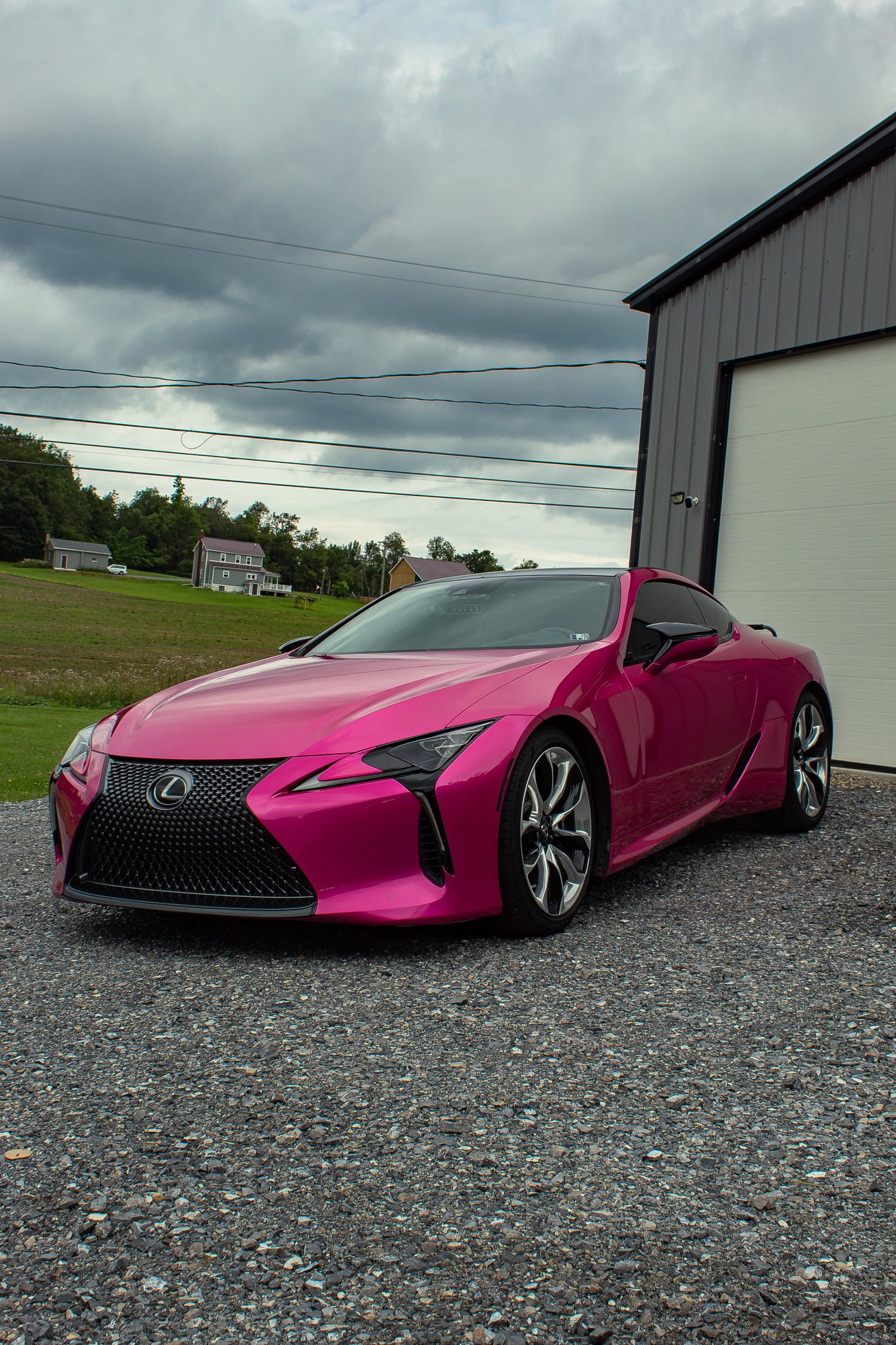 Pictured is a Lexus LC500 that we wrapped in KPMF Gloss Cosmos Pink